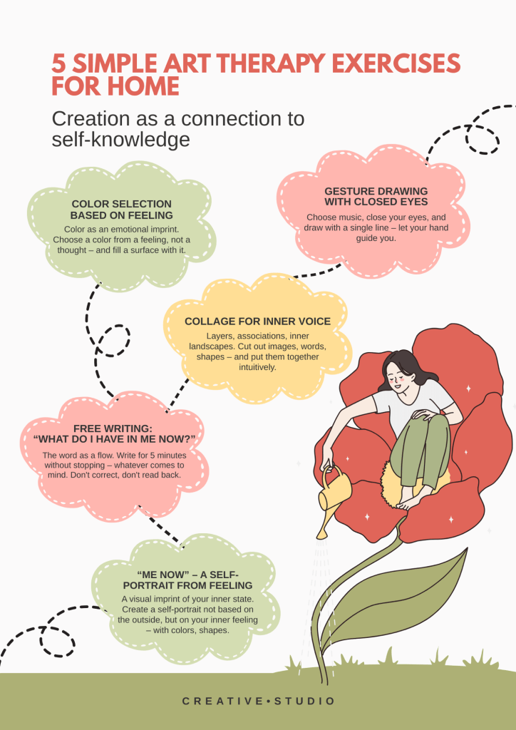 - 5 Simple Art Therapy Exercises for HomeArt therapy doesn’t require special tools or prior experience. All it takes is a little space, time, and openness. These exercises help you reconnect with yourself, slow down, and observeContinue reading “5 Simple Art Therapy Exercises for Home”