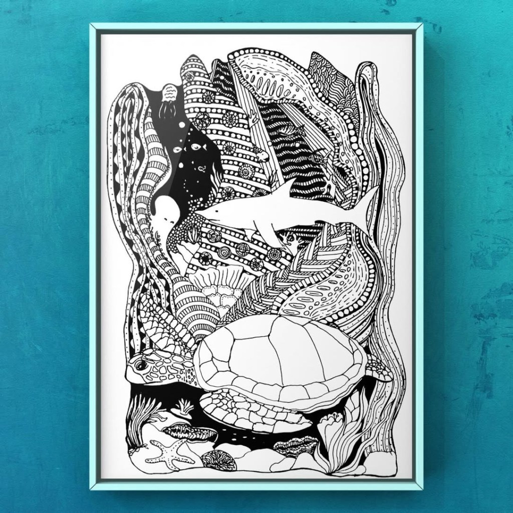 Description: A surreal black-and-white illustration where land, sea, and sky merge into a flowing dreamscape. At the center, a turtle glides through waves and stars, surrounded by fish, plants, and a crescent moon—symbolizing harmony, movement, and cosmic connection. Delivered as a high-resolution digital file for personal use only.