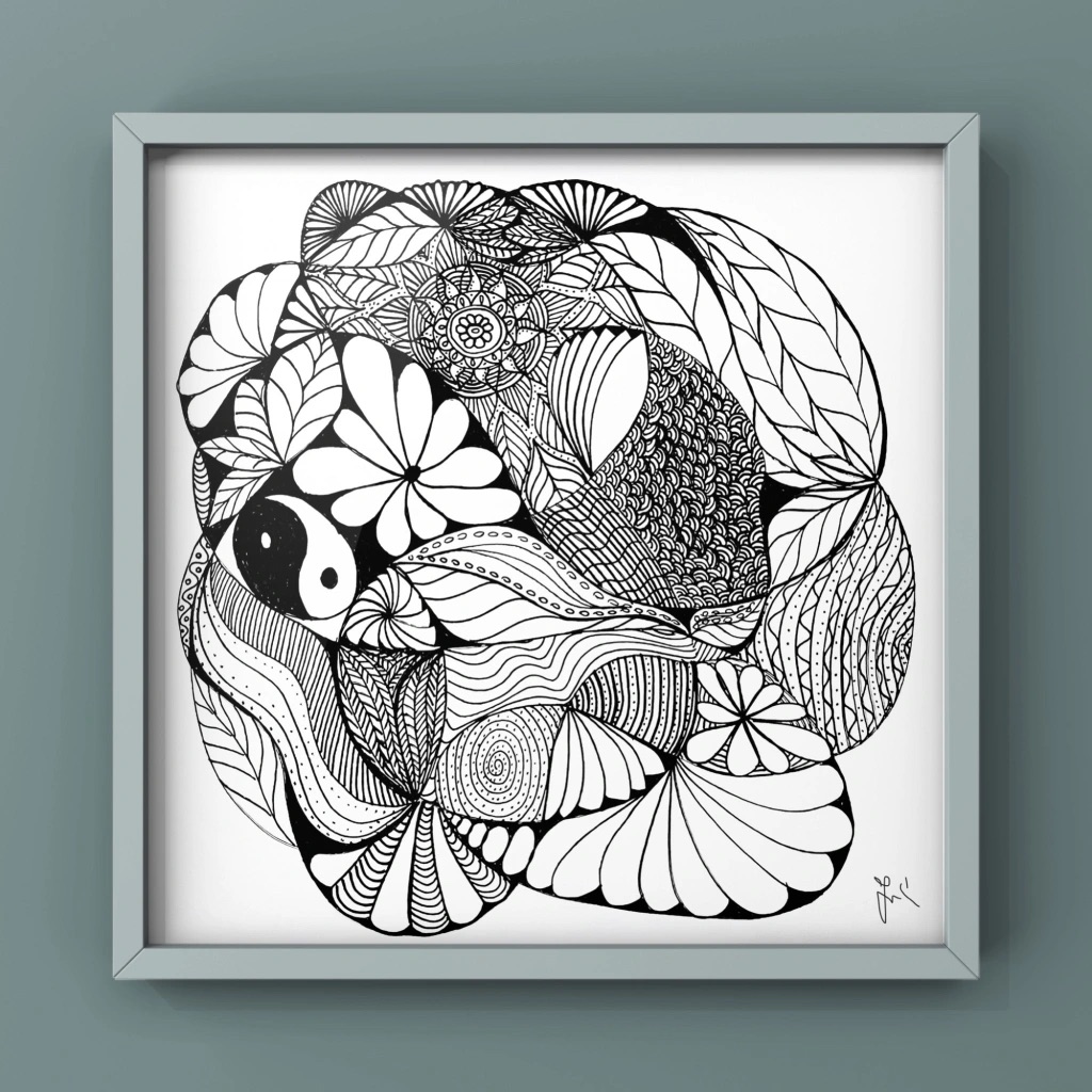 Description: A black-and-white abstract composition where organic forms and geometric patterns converge around a central yin-yang symbol. Leaves, waves, and textures flow in harmony, reflecting the quiet tension between duality and unity. Delivered as a high-resolution digital file for personal use only.