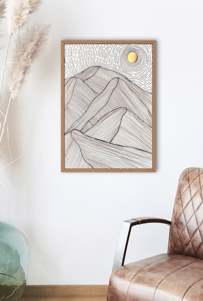 Description: A minimalist line drawing capturing the quiet strength of mountainous terrain beneath a glowing sun. Warm tones radiate from the center, evoking calm, clarity, and natural energy. Delivered as a high-resolution digital file for personal use only.